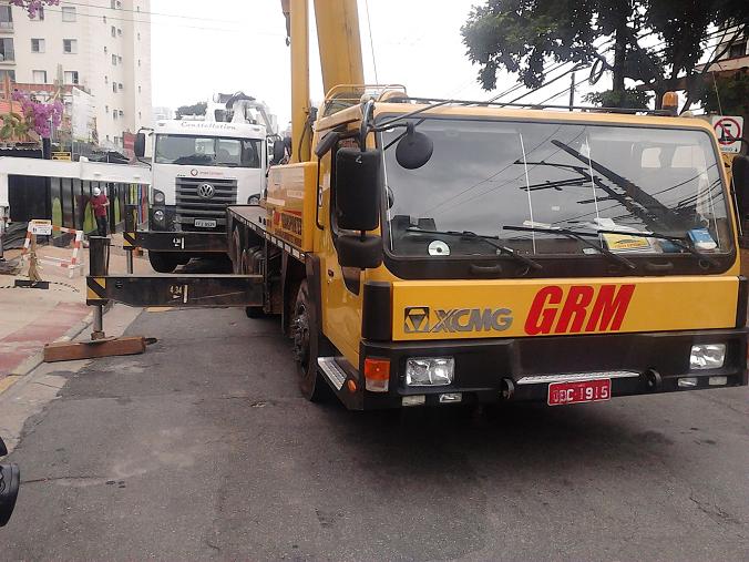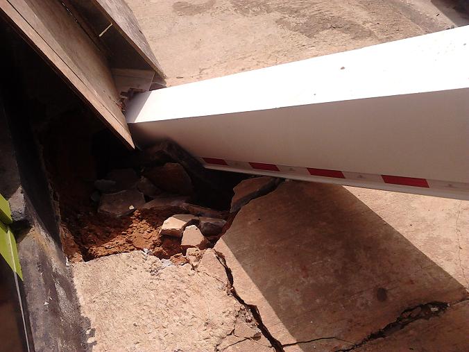 Un camión bomba estaba posicionado para bombear hormigón, cuando en un momento dado el terreno cede produciendo el hundimiento del estabilizador trasero, quedando el camión bomba apoyado sobre sus estabilizadores delanteros.
