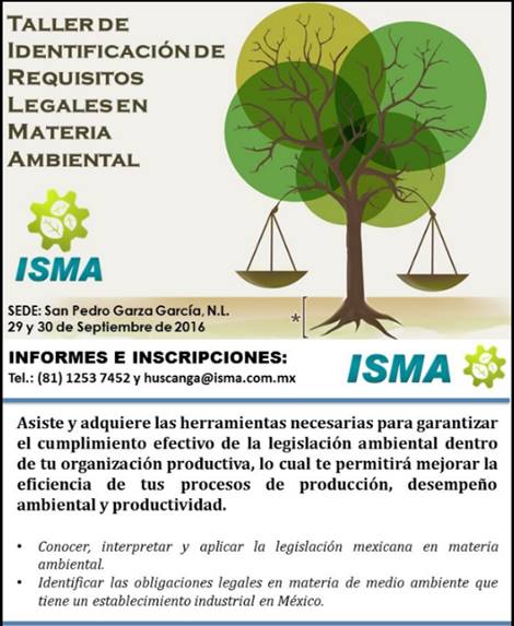 Ingeniería Sustentable y Medio Ambiente, tiene el agrado de invitarte a participar al curso de capacitación “Taller de Identificación de Requisitos Legales en Materia Ambiental” programado para los días 29 y 30 de Septiembre de 2016 en la ciudad de San Pedro Garza García, N.L.